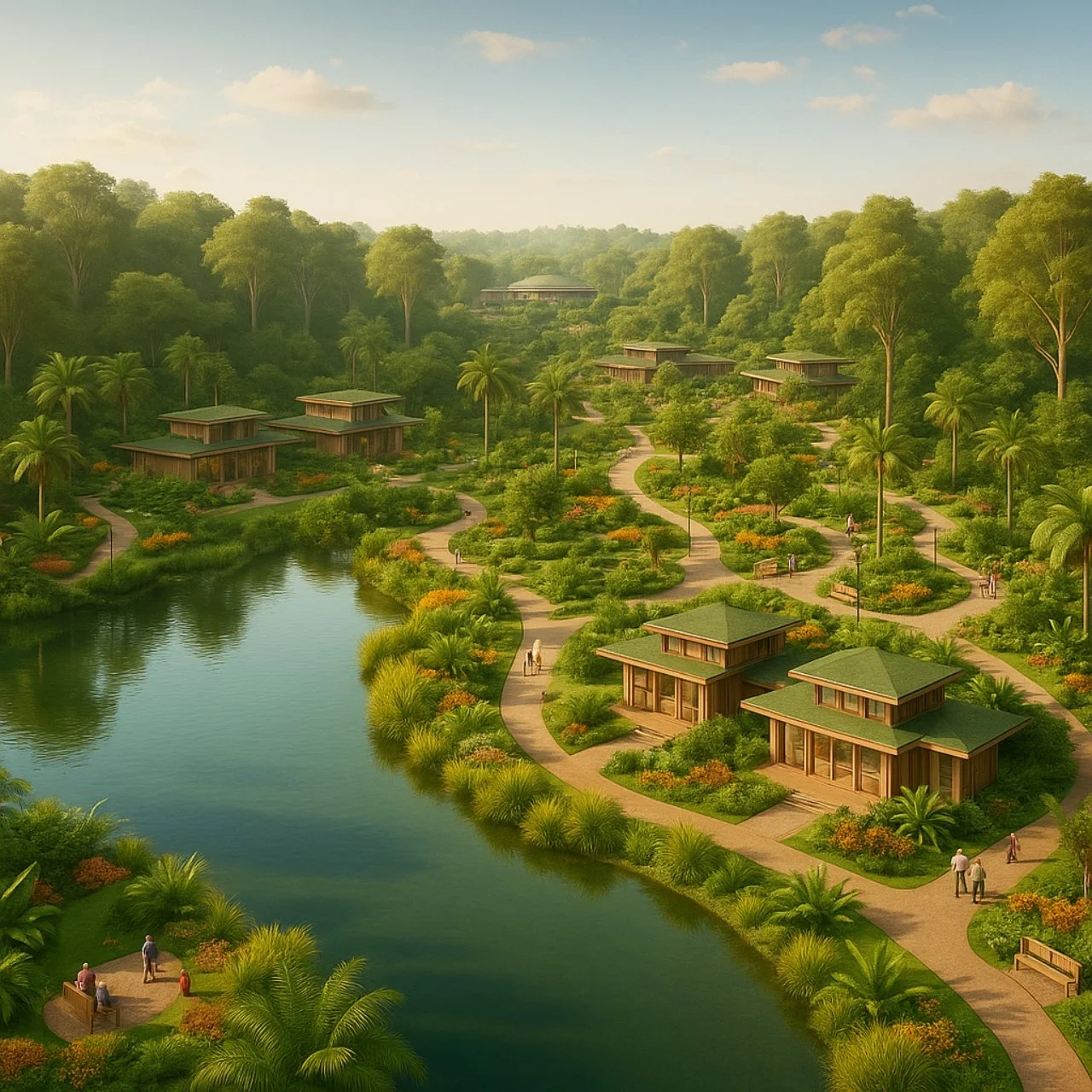 As casas, os clubes, os espaços de cuidado e convivência estão integrados de forma orgânica à paisagem, promovendo saúde física, equilíbrio emocional e conexão com o tempo presente.