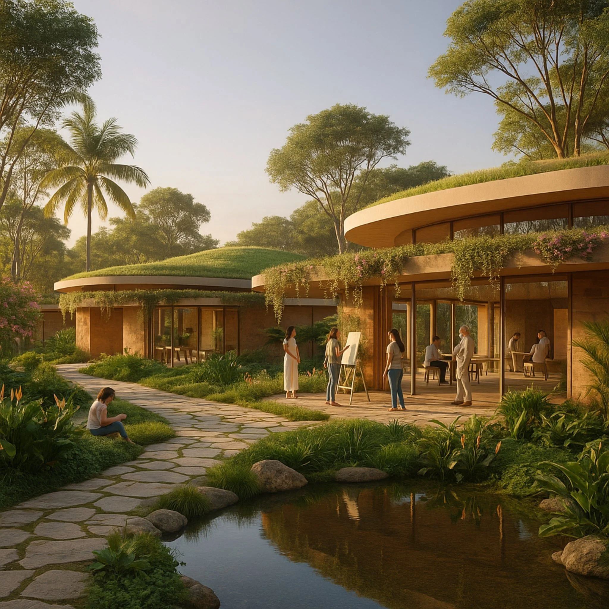 In the second layer, Sanctum Care, WorkVille, and EcoArts School complete the experience, offering environments for integrated health and therapies, nature-connected workspaces, and a school dedicated to sensory education, creativity, and expression.