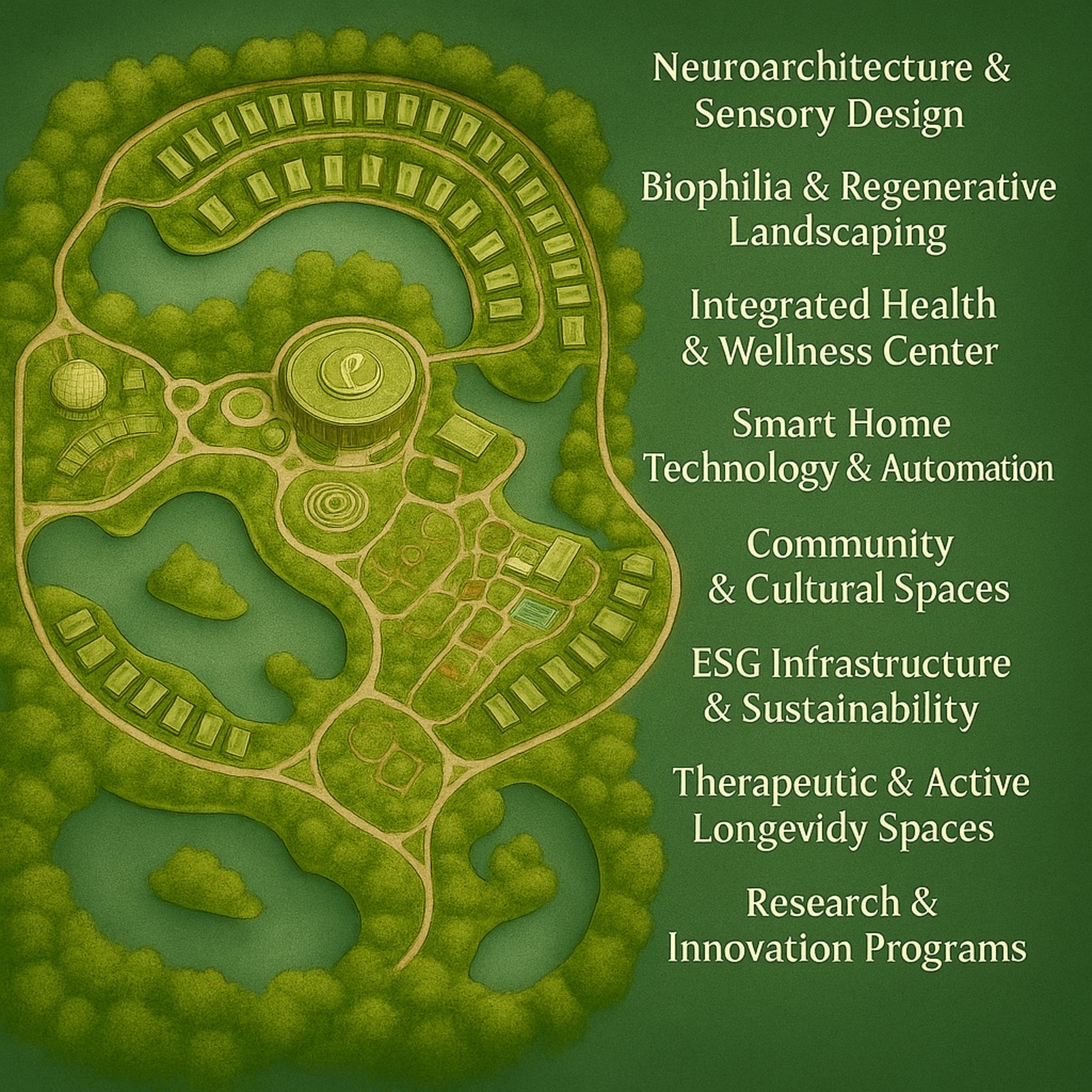 The Senior City is composed of seven complementary projects that create an integrated ecosystem for living, health, well-being, sensory education, culture, and community.